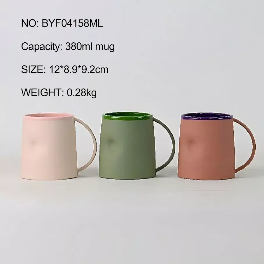 Õige mudel (BYF04158MS) on kolmes pastellivarjundis: helehall, beež ja türkiissinine. See mahutab 270 ml, mõõdab 11,5 x 8,7 x 6,7 cm ja kaalub 0,19 kg. Mõlemad kruusid on sarnased kõrgusega, kehastades värske ja elegantset stiili. Vasakpoolne mudel on pisut suurem ja mahutab rohkem, võimaldades klientidel valida nende vajadustele kõige paremini sobiv.