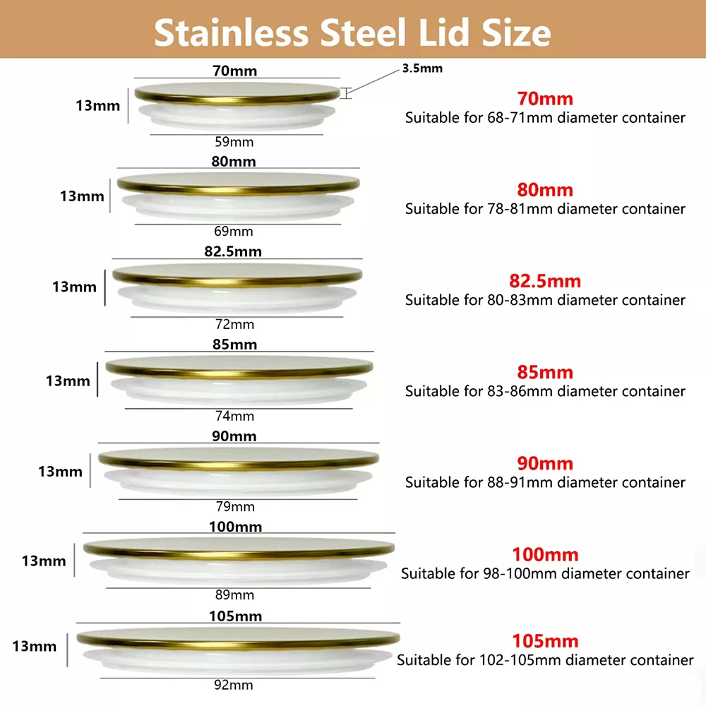 Meie ekraanitrüki roostevabast terasest küünlapurgi kaaned on saadaval erinevates suurustes, kõik üldise kõrgusega 13 mm. Konkreetsed mõõtmed ja ühilduvad konteinerite avamised on näidatud allpool: